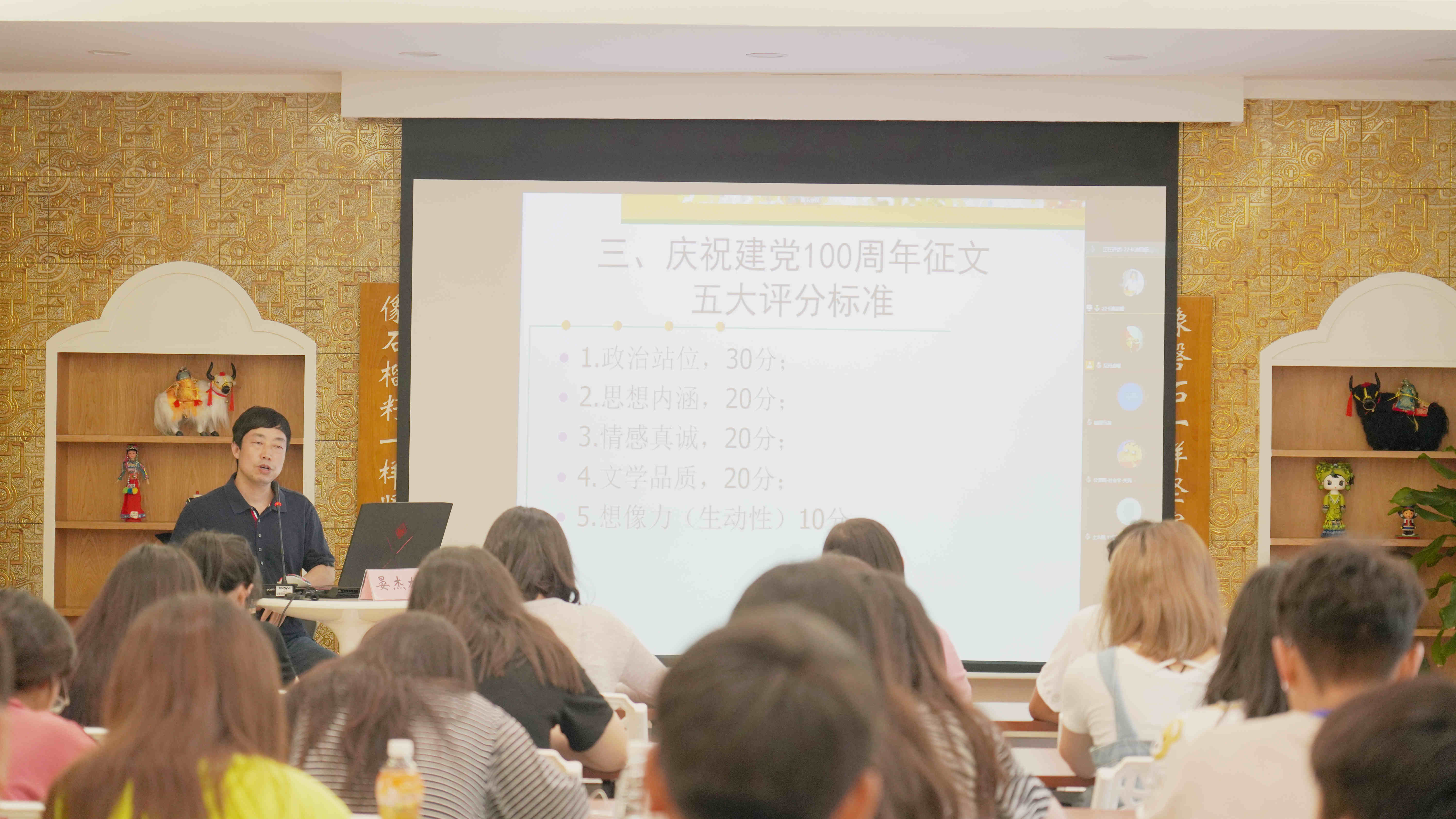 晏教授以阅文者的角度,针对此次征文比赛提出评分标准,指出文章需体现同学们对于百年党史的深刻思考,以具体的、感人的、优美的故事和场景作为基础,寓思于文,寓情于文,引出由外而内,由浅入深的思考。