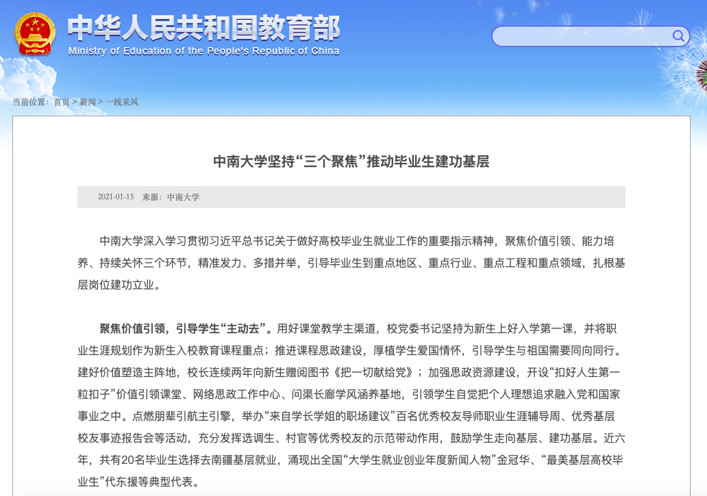 1月15日,教育部“一线采风”以“taptap官方网站坚持'三个聚焦'推动毕业生建功基层”为题单篇推介我校做法。全文如下: