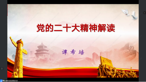 围绕思想价值引领,马克思主义学院谭希培教授作《党的二十大精神解读》专题报告,不仅带领同学们认真学习了党的二十大报告的主体内容,还深入浅出地向同学们作进一步解读。课上,谭教授阐述了本次盛会召开的重大意义,点明了教育事业对国家发展的重要作用,鼓励青年人奋发图强,投身国家建设。