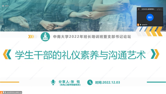 自动化学院连选老师、taptap官方网站张悦老师、计算机学院许宁老师从提升学生干部能力、打造先进集体、人际沟通的礼仪技巧等角度做了具体指导。连选老师从党团建设、学风建设、文化建设、特色优势四个维度讲述了如何去建设一个卓越的班级,为新生班长带领班集体提供思路。张悦老师从礼仪素养和沟通艺术两个方面,阐述了学生干部在各种场合需要注意的礼仪规范。许宁老师认为一个优秀的班集体应该从思想、班风、学风、实践创新、学术研究、榜样力量六个方面着手去重点建设,希望学生干部能够勤思考、敢担当、善作为,最后才能聚人心。