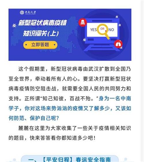 二是“键对键”教育,不容一点疏忽。及时将学校疫情防范知识电子手册传达到每个学生,充分依托学校医学学科专业优势,线上开展疫情防控教育和健康知识普及,提升学生安全防范意识,着力推动疫情防控工作入脑入心入行。