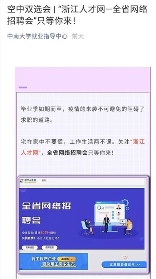 三是创新推进就业指导服务,助力学生求职。积极探索“空中招聘”模式,启动“空中宣讲会”“空中双选会”和“空中面试”,为用人单位引才、学生求职提供线上精准对接服务;着力开展“互联网+”就业指导与服务,组织学校就业指导教师、500强企业HR等开展线上就业指导咨询,增强毕业生疫情防控期间求职信心和求职能力。