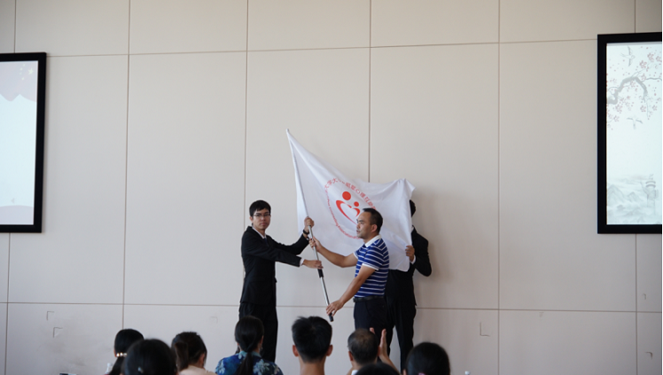 大会第一项,全体成员起立奏唱国歌。然后由张江华副部长致辞,张部长回忆了校心联的发展历程、成立以来的成就,向大家讲述了心理工作的意义与重要性。并为校心联授旗,校心联主席钟楷铭接旗。