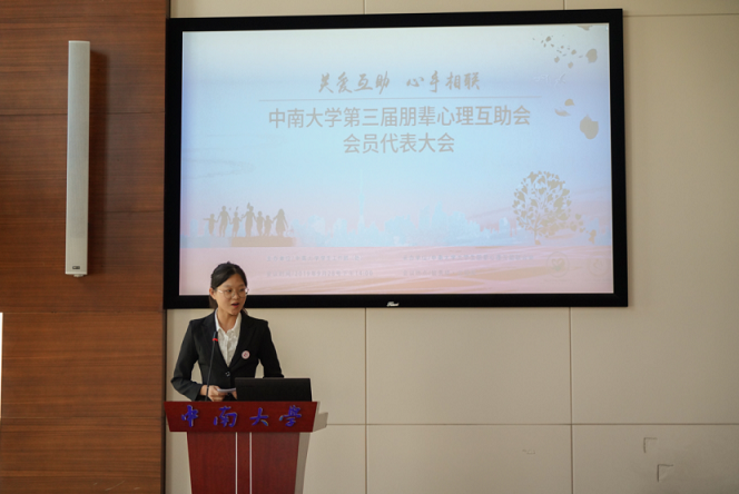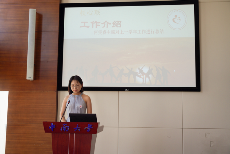 随后校心联第二届主席何雯瑞对上一学年的工作进行总结,介绍了2018到2019年度校心联各方面工作的完善和举办的主要活动。