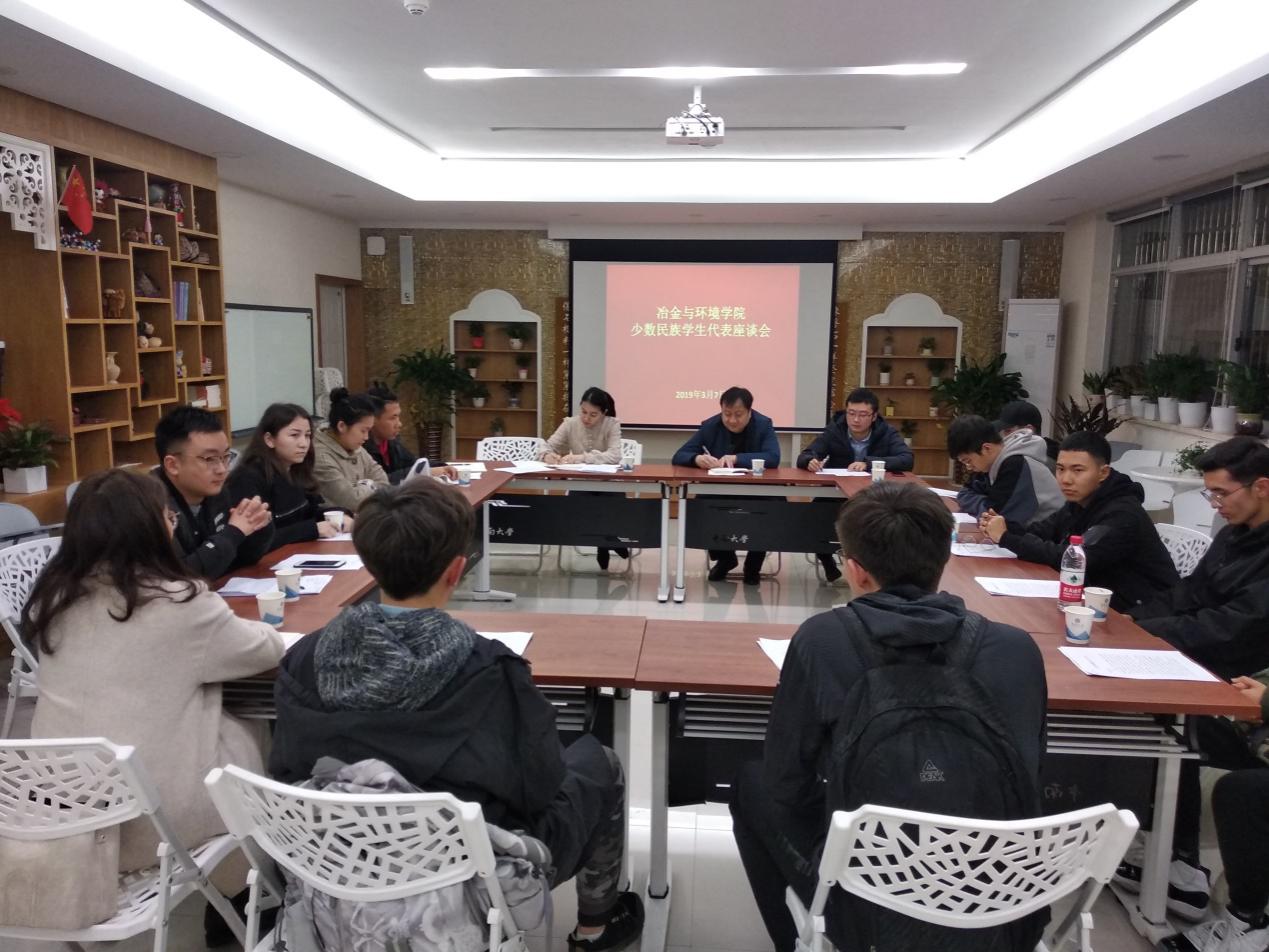2019年3月7日21:00,冶金与环境学院在毓秀楼117召开了新疆籍少数民族学生座谈会。到会的领导老师有冶金与环境学院党委副书记张凯、少数民族学生事务办公室副主任帕提玛、辅导员老师倪莽、雷小轲、柴媛琳、叶尔波拉提、以及冶金与环境学院全体新疆籍少数民族学生。本次座谈会由帕提玛老师主持。