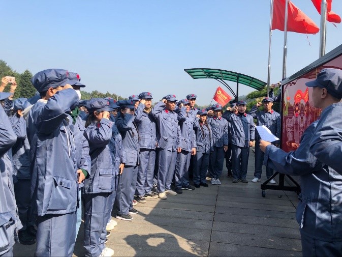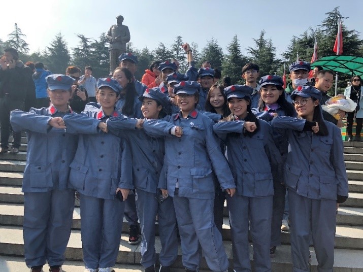 11点10分抵达韶山后,首先来到毛泽东铜像广场。同学们换上统一的红军军服,在老师们的带领下前往毛泽东铜像广场前敬献花圈,摘帽、鞠躬、敬礼,以此来表达对伟大领袖的崇敬和哀思。最后由资安院见习辅导员杨金鑫的带领下,重温入团誓词。