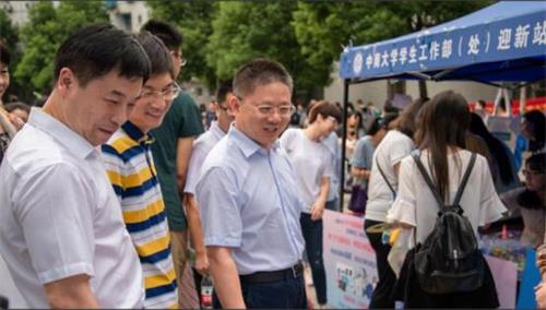 在迎新服务站,蒋建湘看望了迎新志愿者,并跟云麓谷、易班的志愿者进行了互动,同时还与现场的新生和家长亲切交谈和合影留念。