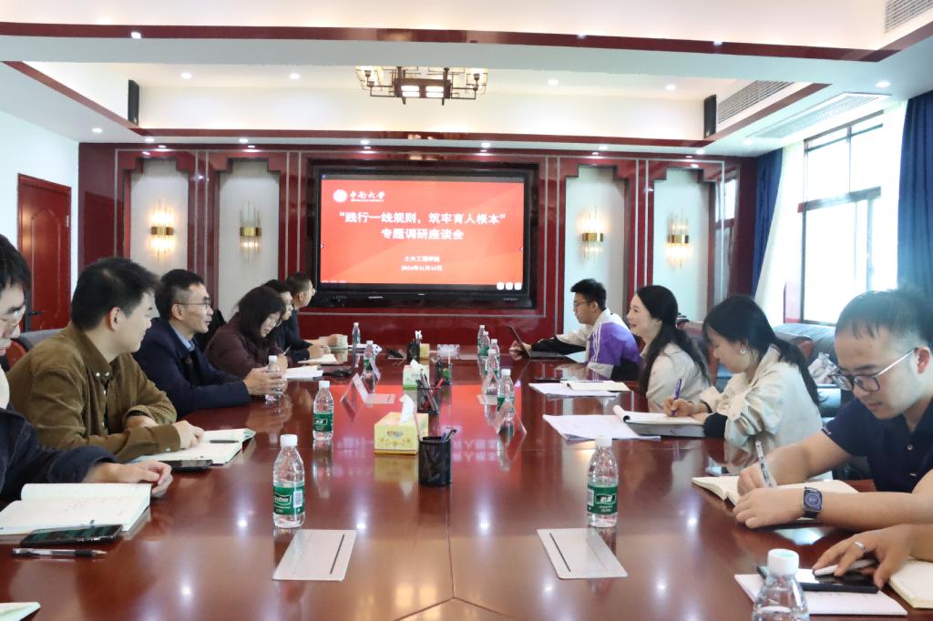 为落实立德树人根本任务,深入实施“时代新人铸魂工程”,推动辅导员践行“一线规则”相关要求,筑牢思想防线与安全防线,11月13日上午,学生工作部就业指导中心主任徐赞一行到土木工程学院专题调研辅导员践行“一线规则”情况。土木工程学院院长王卫东、党委副书记纪晓飞及全体辅导员参加调研座谈会。