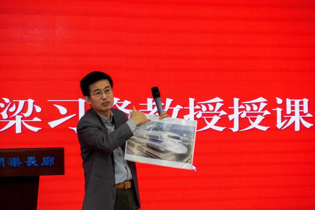 课堂伊始,梁教授从列车外形切入,阐释空气动力学在具体情境下的体现,深入解答了列车外形设计原理、高速列车外形与空气动力性能之间的关系、空气动力学下一步的研究这三大问题。为化抽象为具体,化无形为有形,化理论为实践,梁教授引用其科研经历,通过展示列车的设计模型图片来讲述列车外形存在所要达到的效果,并结合乘客的乘车体验,将抽象的空气动力学在列车运行中的应用深入浅出地讲解给同学们。梁教授还鼓励同学们要脚踏实地,关注时下热点,为像中国高铁一样领跑而努力奋斗。在互动环节,同学们向梁教授提出了自己的问题和思考,梁教授也耐心地给予解答,为同学们的未来规划和学习方向提供了切实指导。