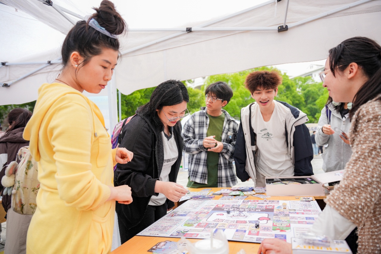 这种代际对话,在“来场填字局”达到高潮。湘雅医学院学生张容舒看着“谜面:能治穷病的不是神,是‘药神’”,迅速写下《我不是药神》:“看电影时,我还没有读大学,今年读到这本书,才更真切感受到‘救死扶伤’的重量。”而在“粉大冶生涯大富翁”点位互动中,人文学院学生罗淑蓝抽到“是否参加读书会”的选项:“选‘是’!只有在阅读里,才能碰见各种各样的人,听说形形色色的事,接触不同年代留下来的思想菁华!”