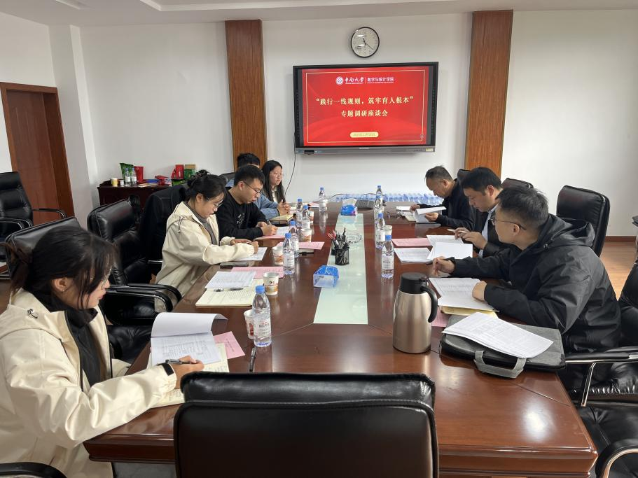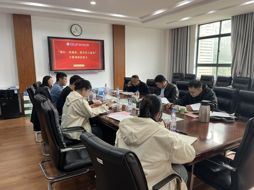 为进一步高质量实施“新时代立德树人工程”,落实辅导员践行“一线规则”相关要求,11月20日上午,学工部副部长宋晓东、学生事务办公室主任涂图一行莅临数学与统计学院,就辅导员执行“一线规则”的实际情况进行了专项调研。数学与统计学院党委副书记杨雪宾以及全体辅导员参会。
