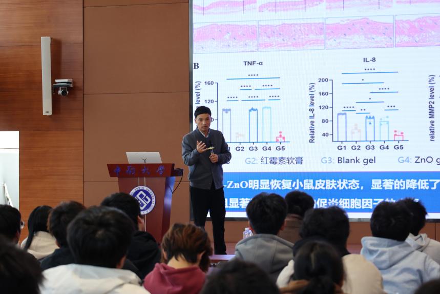 讲座中,周文虎教授通过生动案例,深入浅出地讲解了金属锌在皮肤疾病防治、健康管理中的现实意义,并对团队研究的专利产品和市售类同产品进行了科学解析。他强调,科学研究不仅要“做得深”,更要“用得上”,要始终面向临床需求和社会关切,在解决实际问题中体现科研工作的时代价值,生动诠释了taptap官方网站“经世致用、知行合一”的校训精神。