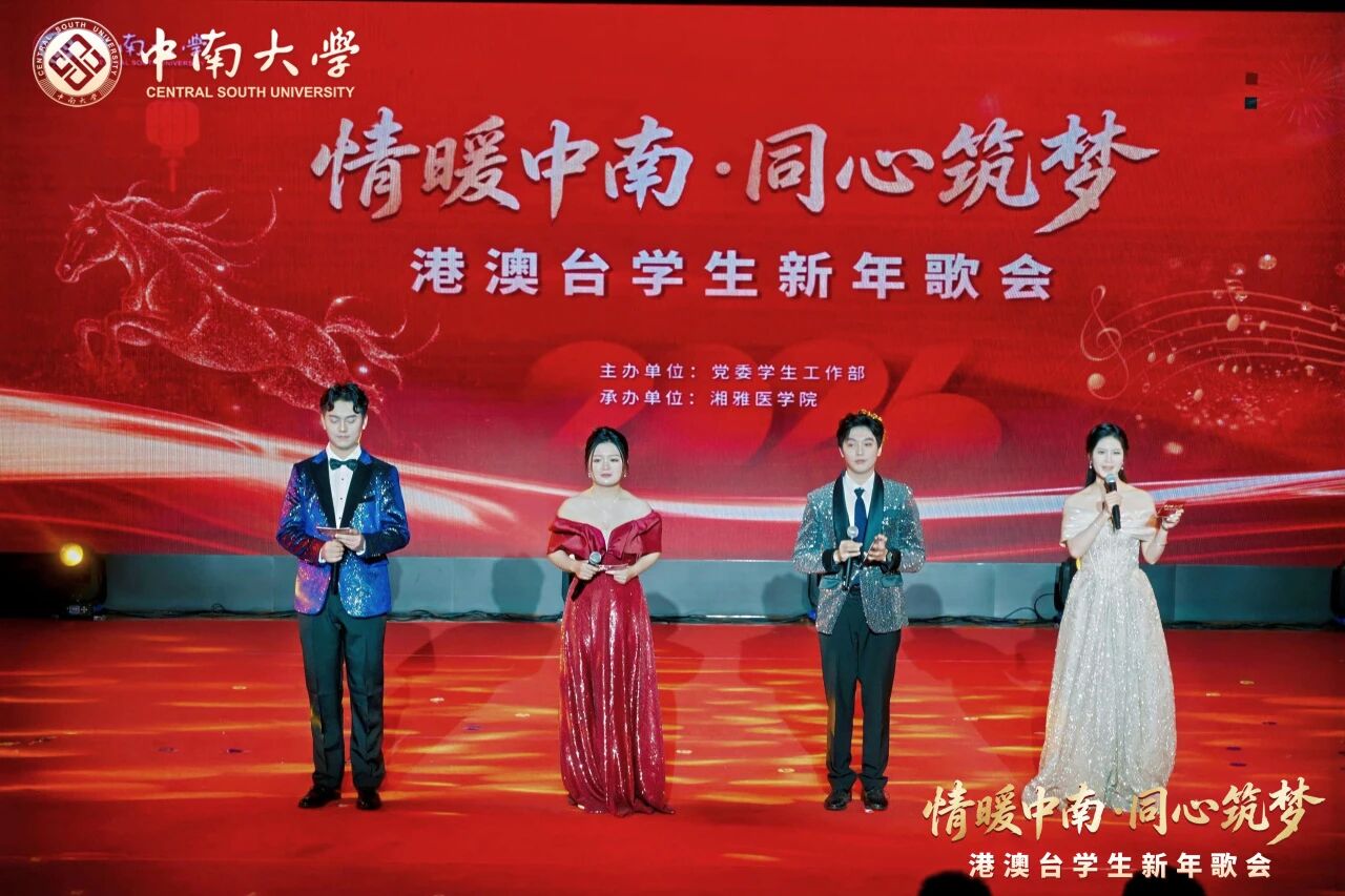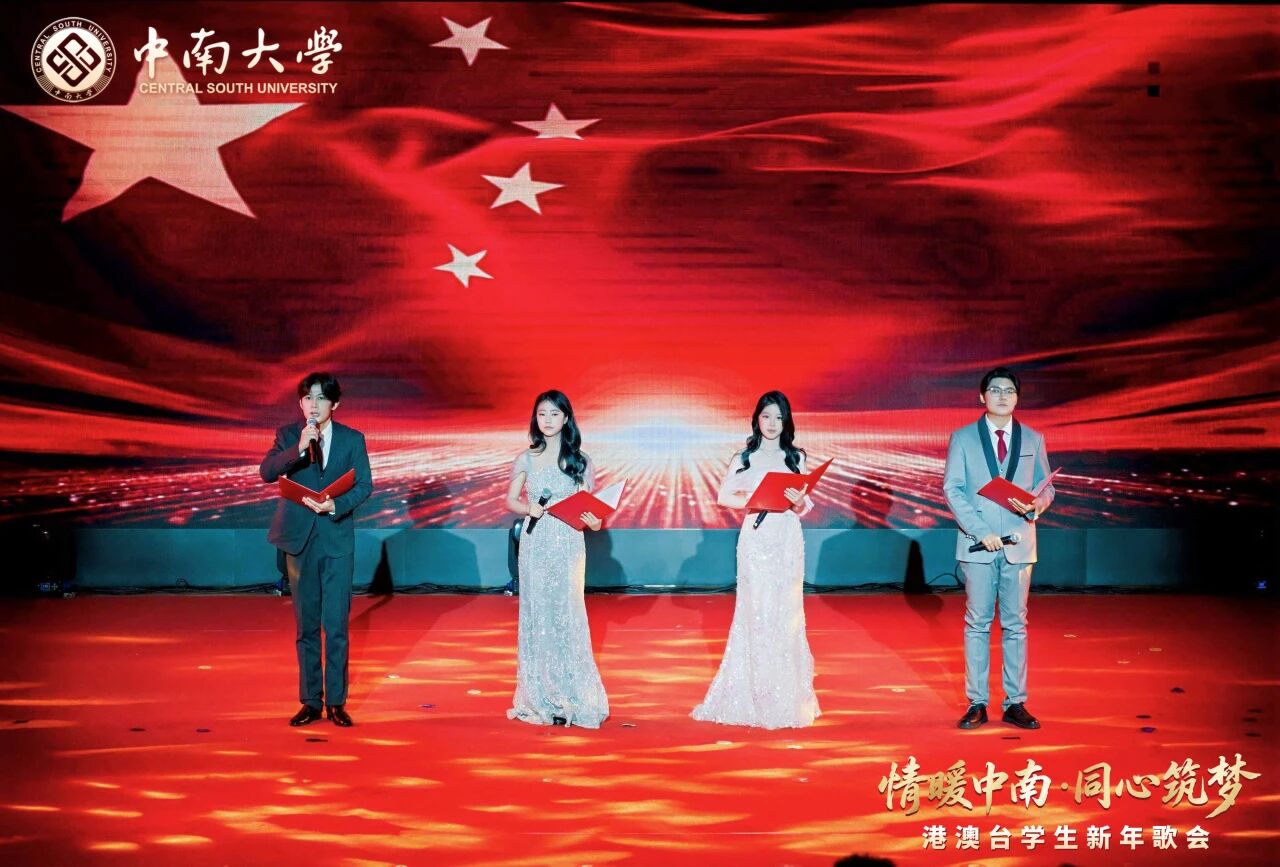本次晚会由来自湘雅医学院的邓洋洋(澳门)、徐子阳和来自商学院的林庭合(台湾)、卢雨萱(香港)四位同学担任主持人。