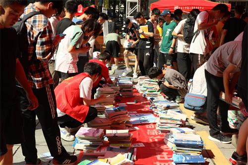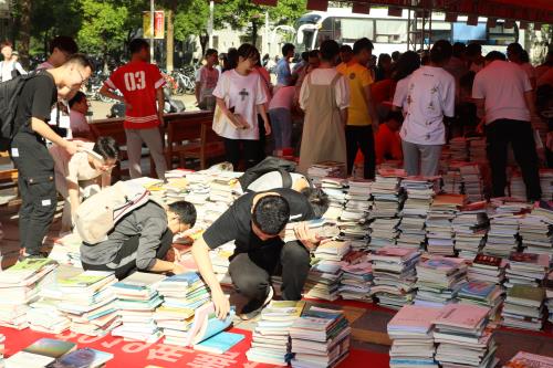 六月的熏风送来夏的气息,火热的艳阳掩盖不住同学们的热情。活动现场人头攒动、摩肩接踵。同学们有的手里抱着一大摞书,还有的装满了背上的背包,更有甚者大包小包齐上阵,塞得满满当当。在这样一场盛大的“丰收”之中,同学们脸上都洋溢着喜悦的神情。各式各样的书籍按学院顺序依次摆好,在地上堆成了一道道绵延起伏的“山脉”,同学们在这“书山”之中,尽情挑选自己所需书籍,好不快活!