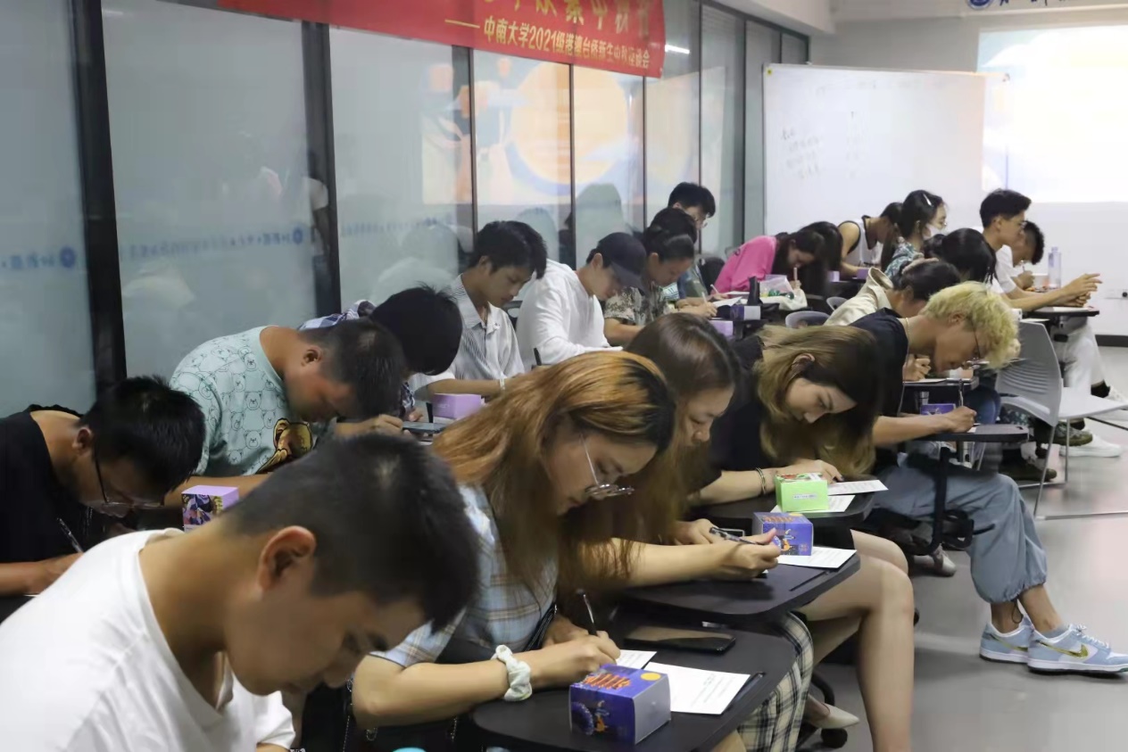 随后,主持人邀请往届港澳台学生负责人向新生分享了自己的大学经历,为新生答疑解惑,并赠送月饼,表达中秋的祝福。随后,在场新生互写、互送明信片,于纸笔间传达了温暖。