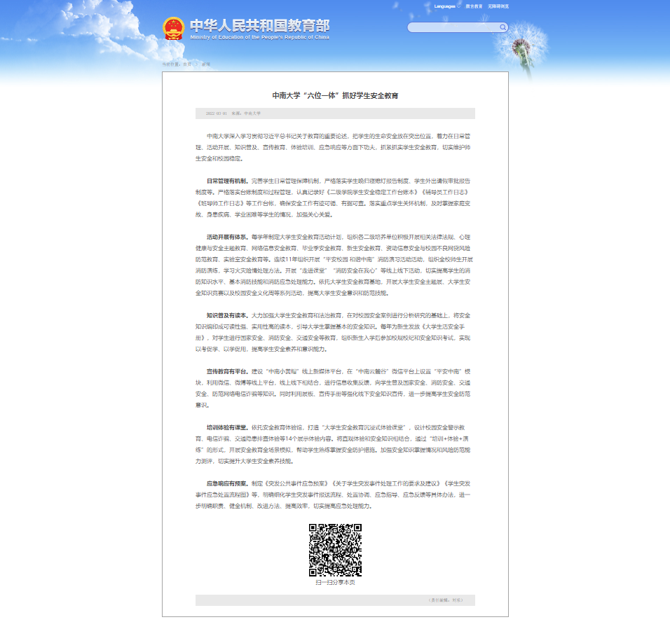 宣传教育有平台。建设“中南小黄帽”线上新媒体平台,在“中南云麓谷”微信平台上设置“平安中南”模块,利用微信、微博等线上平台,线上线下相结合,进行信息收集反馈,向学生普及国家安全、消防安全、交通安全、防范网络电信诈骗等知识。同时利用展板、宣传手册等强化线下安全知识宣传,进一步提高学生安全防范意识。
