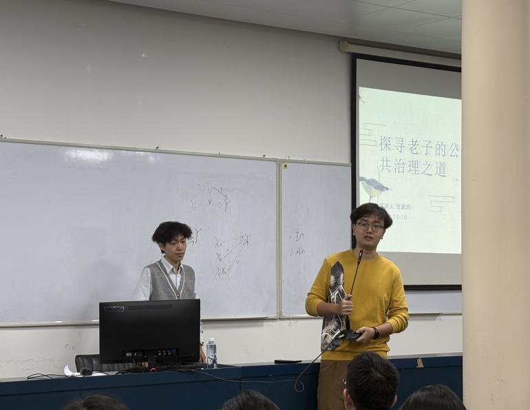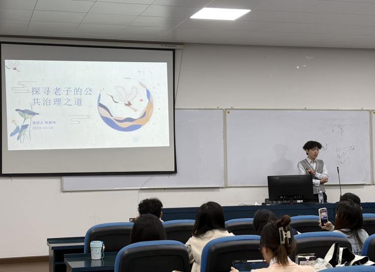 2024年11月10日晚上18:00,“公行天下·聚焦美丽中国”学术沙龙第二期在taptap官方网站铁道校区公共管理学院院楼308教室举行。此次沙龙以“探寻老子的公共治理之道”为主题,由taptap官方网站人文学院24级哲学研究生张家玮同学作为主讲人,由taptap官方网站公共管理学院24级社会学研究生谢承霖同学作为主持人。本次学术沙龙活动吸引了学院一百余名研究生到场聆听,现场学术氛围浓厚。