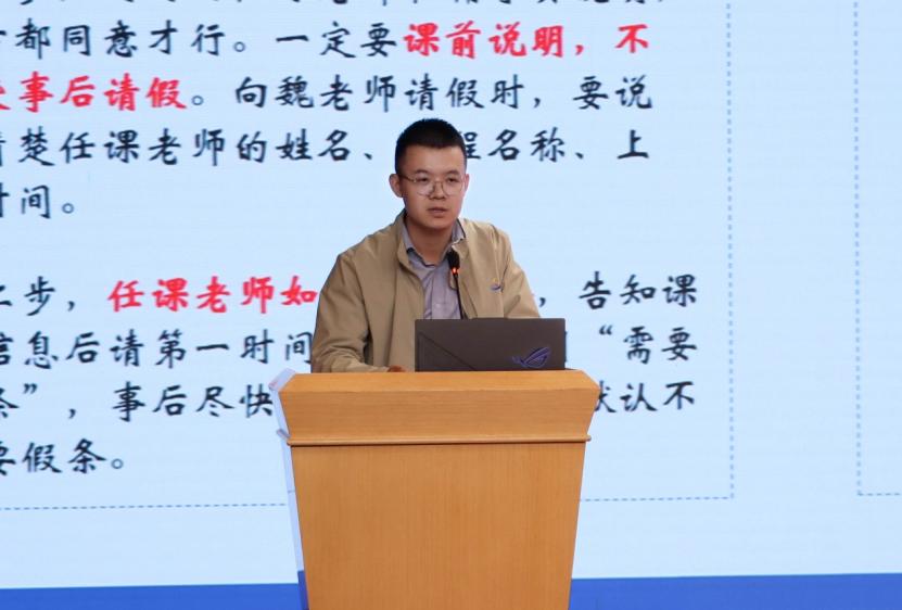 会议伊始,魏铭老师对2023级学生的常规工作进行总结分析,并详细介绍了毕业规划相关工作的开展情况。在常规工作方面,他从请假纪律、生命财产安全与法律意识、学业规章三个方面展开规范性事务讲解,用具体数据与事例说明了遵守规范的重要性。在毕业规划方面,他对保研推免、留学、考研三大深造道路和体制内、体制外两大就业方向分别进行分析,明确不同道路的考核标准与难度,帮助同学们客观理性研判自身情况、明晰主要方向。