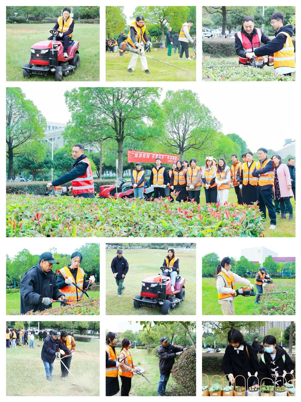 “油门轻缓踩,遇障提前绕,方向要稳当!”“平剪要稳,弧线得柔,顺着植物‘脾气’来!”园艺专家王在威用通俗易懂的语言,现场传授割草设备和绿篱修剪的操作要点与实用技巧。理论“充电”完毕,师生们跃跃欲试,在后勤绿化人员的带领下,开启了一场汗水与绿意交织的沉浸式劳动体验。草坪养护组最为“吸睛”,驾驶草坪车的师生们操作设备驶过之处,留下一道道清爽的绿痕,原本参差不齐的草叶瞬间被“剃”得平平整整;“绿篱修剪组”师生化身“绿化雕刻大师”,“咔嚓...咔嚓...”每一剪落下,都带着几分专注与试探,随着杂枝被修整,棱角分明、线条流畅的灌木造型逐渐显现,师生们脸上洋溢着成就感的笑容。