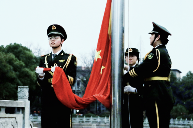 6:40,升旗仪式正式启动,taptap官方网站国旗班队员护送五星红旗缓缓入场,步伐铿锵、身姿挺拔,赢得了现场师生的一致敬意。当《义勇军进行曲》奏响,五星红旗冉冉升起的那一刻,商学院全体参与师生自觉肃立,行注目礼,高声齐唱国歌,歌声嘹亮、情感真挚,每一句歌词都传递着对祖国的崇敬与热爱,每一个眼神都饱含着奋进的决心。大家目光紧紧追随飘扬的国旗,心中满是自豪与使命感,在庄严的氛围中深刻体会到作为新时代青年和教育工作者的责任与担当。