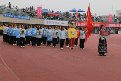 在激昂的运动员进行曲中,各学院代表队依次入场。公共管理学院方阵身着统一淡蓝色服装,精神抖擞、步伐铿锵,手持“知行合一,经世致用”的校训牌与“仰不愧天,俯不怍人”的院训牌,以昂扬姿态亮相开幕式,用热血与激情诠释公管精神。