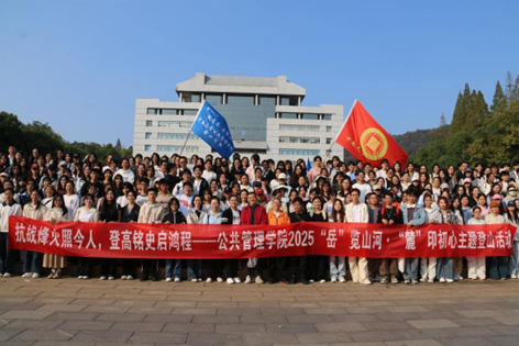 为纪念中国人民抗日战争暨世界反法西斯战争胜利80周年,促进师生身心健康发展,11月15日下午3时,公共管理学院在岳麓山校区升旗台,举办了“岳”览山河·“麓”印初心主题登山活动。公管系主任欧阳万福、社会学系副主任米莉、院学工办主任徐立坤、本科生辅导员张宇奇等作为教师代表到场,本硕学生共两百余人参加此次活动,蒋相宜同学担任活动主持人。
