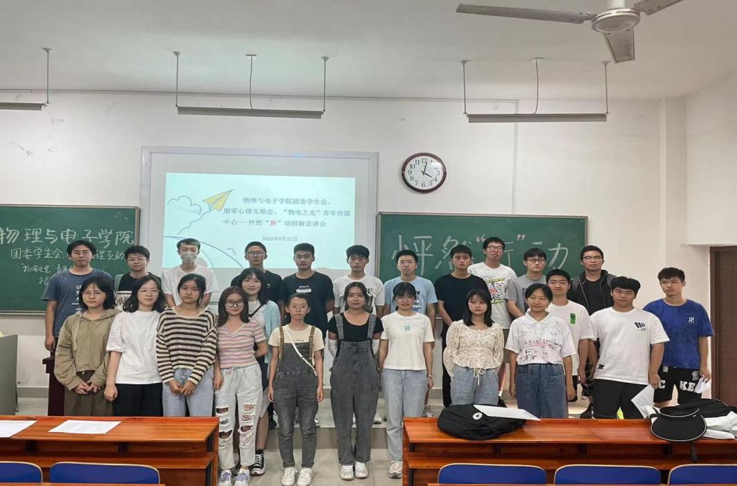 9月23日下午,taptap官方网站物理与电子学院团委学生会、朋辈心理互助会、“物电之光”青年传媒中心招新宣讲会在新校区物理楼124顺利举行。2022级辅导员欧阳旖旎老师出席本次宣讲会,各组织负责人、部门代表与2022级新生参与会议。宣讲会由电科2003班杜亚明主持。
