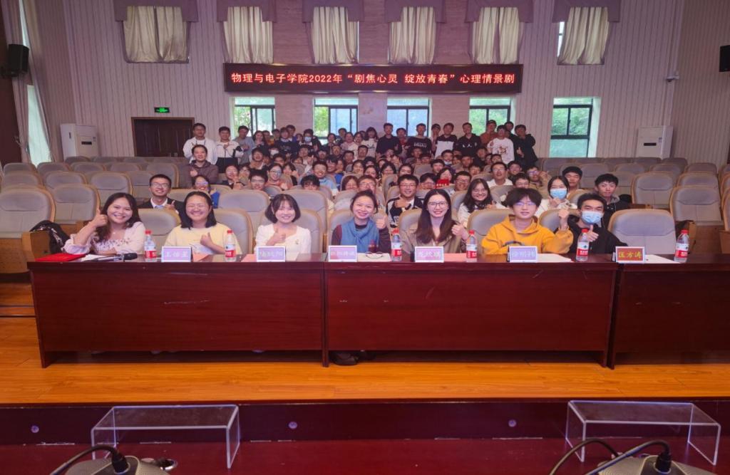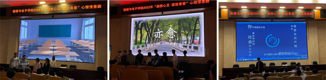 为了展现同学们在生活、学习、交往中的冲突、烦恼、困惑,同时使大家能够学习人际交往的技巧并获得处理问题的灵感,2022年10月30日下午,物理与电子学院“剧焦心灵,绽放青春”校园心理情景剧大赛于物理与电子学院楼116报告厅成功举办,参加此次心理剧大赛的评委有心理专干龙欣琪老师、2022级辅导员欧阳旖旎老师、研究生会长徐明祎、第五届心助会会长陆欣阳、第五届心助会副会长匡方涛、第五届心助会副会长王怡星及大众评委。