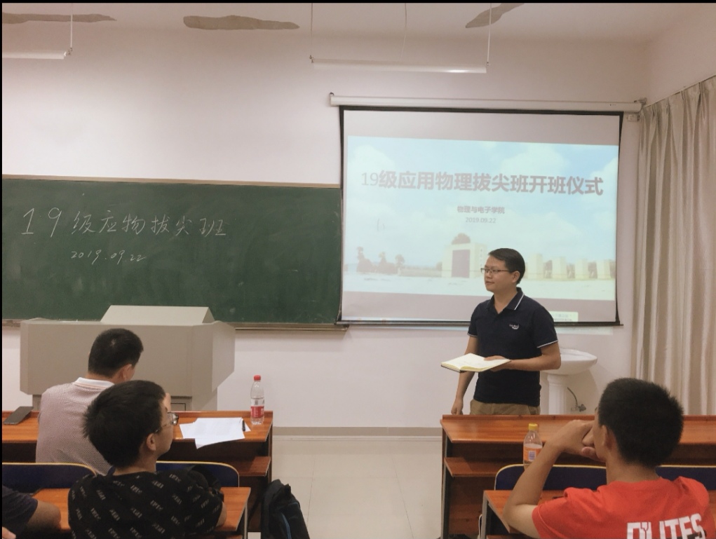 2019年9月22日,物理与电子学院19级应用物理拔尖班在物理楼234教室举行开班仪式,院长孙克辉,副院长龙孟秋,副书记谢群,班导师孙佳,辅导员郭学斌参与了本次仪式,仪式由孙佳老师主持。