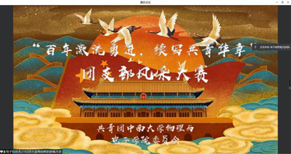 4月6日下午,为庆祝中国共青团成立一百周年,彰显学院新时代青年风采,展现各团支部良好风貌,物理与电子学院以线上答辩形式举办“百年激流勇进,续写共青华章”团支部风采大赛。物理与电子学院党委副书记谢群及全体辅导员作为评委出席比赛。