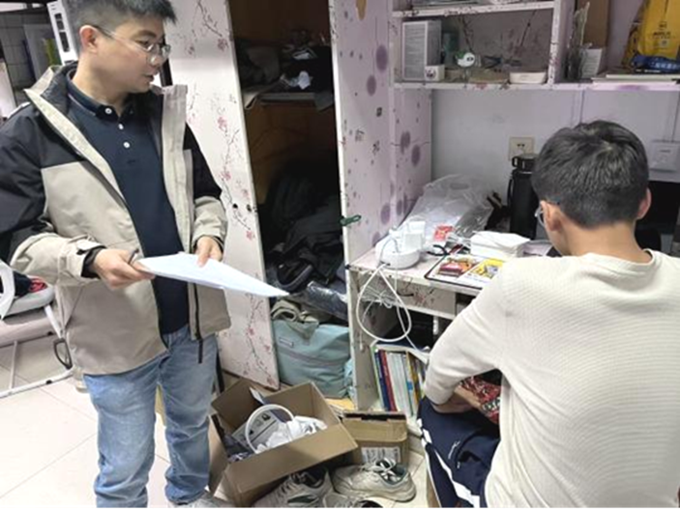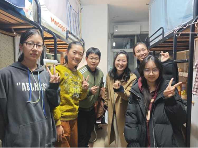 正值本科新生入校第100天,会议结束后,李书记、辅导员与班导师们到2025级学生宿舍走访,关心学生生活状态,检查消防安全。