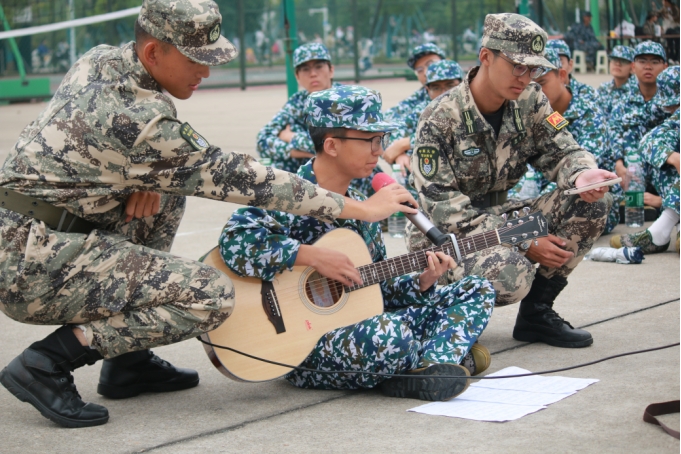 活动在唐语乐同学弹唱的《飞云之下》中拉开序幕,轻柔的吉他声抚平了训练场的疲惫,同学们跟随旋律轻声哼唱。随后,甄灏轩同学以一曲《我们的时光》掀开了军训日记的扉页,歌声中饱含着汗水与坚持,也承载着青春的炽热与真挚。“这就是我们的时光”——当歌词响起,军训的记忆变得鲜活,似乎被汗水浸透的迷彩衣角、一起咬着牙坚持的军姿:都在跟着旋律轻轻晃动,成了青春里最生动的注脚。