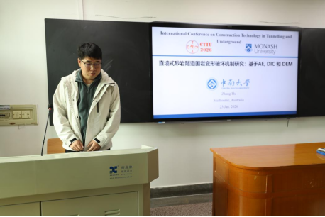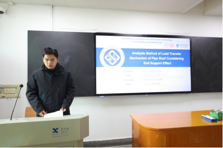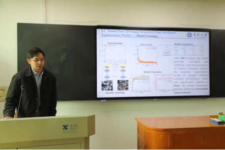 张运波以《Intelligent Semantic Segmentation and 3D Joint Mapping of Tunnel Faces Using Swin-DeepLabv3+ and Edge Computing》为题,提出基于Swin-DeepLabv3+与边缘计算的隧道掌子面智能语义分割与三维联合映射方法,为隧道工程数字化勘察提供了全新思路;朱仔旭聚焦盾构施工核心痛点,构建了盾构刀具泥饼粘附风险的智能预测与分级评价体系;游钰阳创新提出基于少样本机器视觉的隧道岩体颗粒级配与形态智能分析框架,破解了传统岩体参数检测效率低、精度不足的行业难题;唐宇融合智能岩体分级技术,建立CatBoost-GMDH两阶段可解释TBM推力预测模型,为硬岩隧道掘进装备的智能控制提供了坚实的理论支撑。