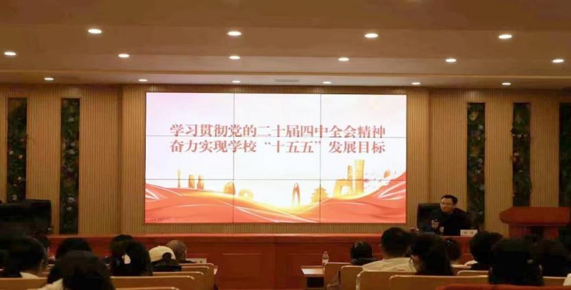 何军围绕二十届四中全会的核心内容展开深入解读。他强调,面对当前国内外发展形势与任务,要继续精准贯彻党中央决策部署,坚决实现全年经济社会发展目标,并引导师生深刻认识全会精神的时代意义,增强责任感与使命感。在解读全会精神的基础上,何军结合学校“十四五”时期发展历程,从多个关键领域梳理了学校取得的标志性成就。