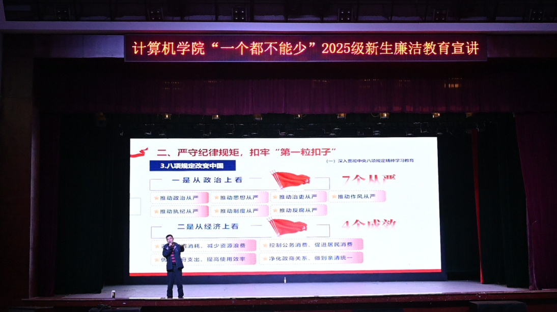 为引导新生筑牢遵纪守法、廉洁自律的思想根基,树立正确的世界观、人生观、价值观,勇担时代赋予的重任,10月24日,计算机学院于麓南校区礼堂开展了“扣好第一粒扣子”主题2025级新生廉洁教育活动。本次教育活动由计算机学院党委副书记王新辉主讲,学院2025级全体新生到场参加。