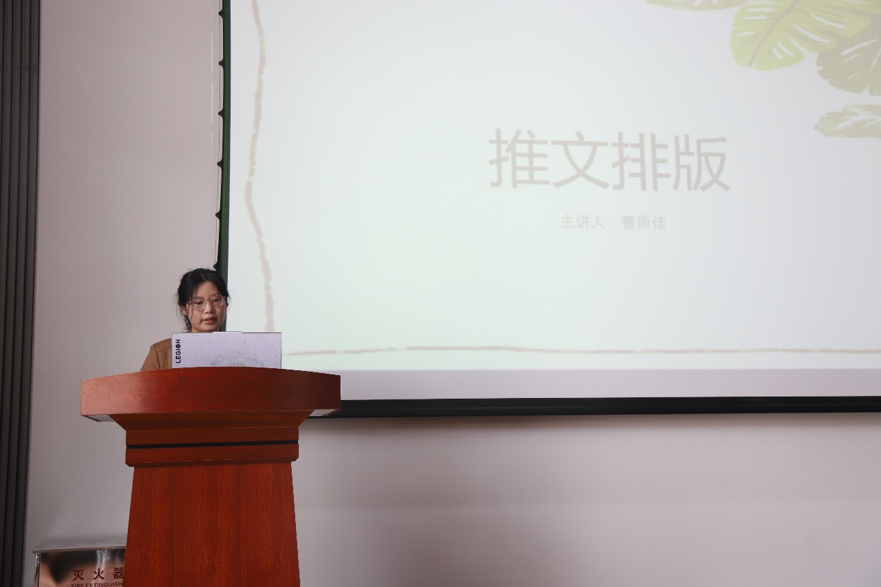 在业务培训环节,学院团委宣传部部长吴宗翰围绕新闻稿写作与摄影技巧进行细致讲解,副部长曹雨佳则针对公众号推文排版方法展开分享,内容实用、干货满满,有效提升了同学们的宣传实操能力。
