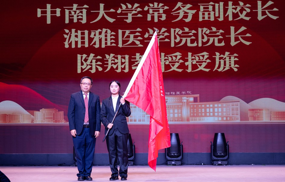 陈翔常务副校长为2025级医学生代表授学风建设“卓越”旗。授旗以信,承旗以志。这面旗帜,是湘雅“医魂”的具象传承,是“公勇勤慎”精神在新时代的回响。医学是为生命赋予希望的神圣志业,医者是人类对抗病痛的前沿卫士,使命如山,责重如岳。希望湘雅学子能以此为始,恪守初心,矢志精进,在医学的源头夯实根本,追求卓越之境,为未来护航生命、奉献社会,铸就最为坚实的根基。
