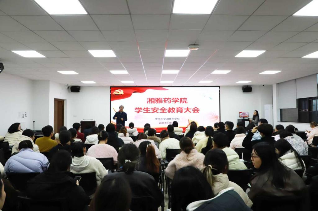为深入贯彻落实学校校园安全工作部署,切实强化学生安全防范意识,保障学生健康成长与学院稳定发展,2025年12月24日,湘雅药学院在杏林校区药学楼召开学生安全教育大会。学院党委书记胡平安主讲,学生工作办公室主任、各年级辅导员及全体学生党员参会,会议由桂玲智主持。