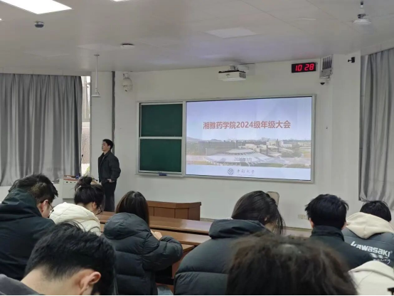 为进一步加强年级学风建设与日常管理,强化学生安全意识,规范党员发展流程,引导同学们科学规划未来发展,湘雅药学院2024级全体学生于3月4号在福庆楼T106召开年级大会暨生涯规划宣讲会。本次大会围绕学业提醒、安全提醒、日常管理、发展党员、生涯规划五大主题展开,重点聚焦生涯规划指导,为同学们下一阶段学习、生活与成长发展指明方向。
