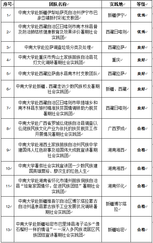 按照《2019年taptap官方网站“56度中南”少数民族学生专项暑期社会实践立项的通知》要求,经考核立项的13个实践团队到基层分别开展党和国家大政方针宣讲、国情调研、民族团结创建情况调研、科技、文化、医疗卫生、志愿服务下乡、地方经济社会发展咨询等社会实践活动,取得良好效果。10月9日经组织评委对2019年立项团队进行实践成果验收答辩评审,并报部务会审定评议结果如下。