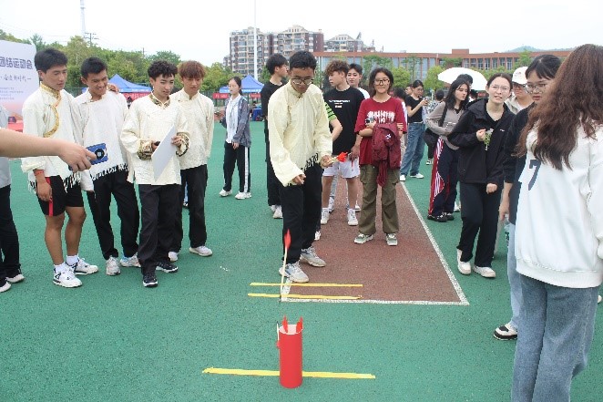 投壶为投掷游戏,在战国时期较为盛行,尤其是在唐朝,得到了发扬光大,历史悠久。参赛者只须将手中箭投入1米外的壶中。看似简单,但极其需要耐心与眼力,选手们小心翼翼投掷,全神贯注观察,为这一项比赛增添了些许紧张气氛。