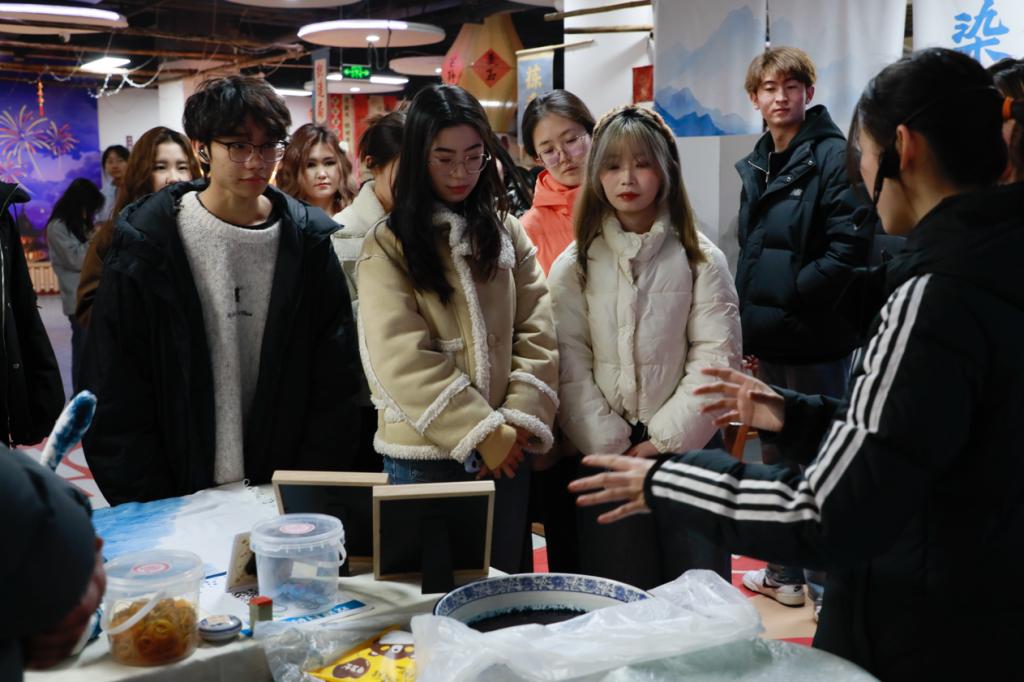 体验馆的展示内容丰富多元,贯穿“五个共同”中华民族历史观。同学们跟随讲解员的细致介绍,详细了解了宝庆瓷刻、泥书、浏阳夏布织造技艺、邵阳隆回年画、江永女书等众多非遗项目,深刻感受了铸牢中华民族共同体意识中的湖南故事。活动现场,傩面具制作区域充满了欢声笑语。同学们在非遗传承人的指导下,通过模具脱坯拿到傩面具坯体。同学们根据自己对傩文化的理解,进行创意设计。从线条勾勒到色彩填充,大家全神贯注,将自己对优秀传统文化的热爱融入其中。扎染区域则是一片五彩斑斓的景象。同学们认真学习扎染技艺,折叠、捆扎、染色,晕染出的图案或如山川河流,或似星辰大海,充满了惊喜和艺术感。编织区同样热闹非凡。同学们手持竹条、丝线,在传承人的耐心教导下,经过不断尝试,反复琢磨,一件件精美的编织作品逐渐成型。