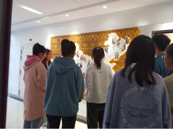 会议伊始,大家在古丽老师的带领下,参观了民族团结文化墙、民族团结进步之家等民族团结进步教育实体资源。同学们在老师的带领下参观了民族文字书法作品、民族特色饰件、民族建筑物模型等充满各民族文化的内容,并体验了民族服饰模拟。随后同学们移步民族团结进步之家,参观室内摆设的乐器和特色物件,同学们体验了民族乐器,一名同学则向大家演示了他们的民族乐器。同学们为美妙的乐声发出了阵阵掌声。