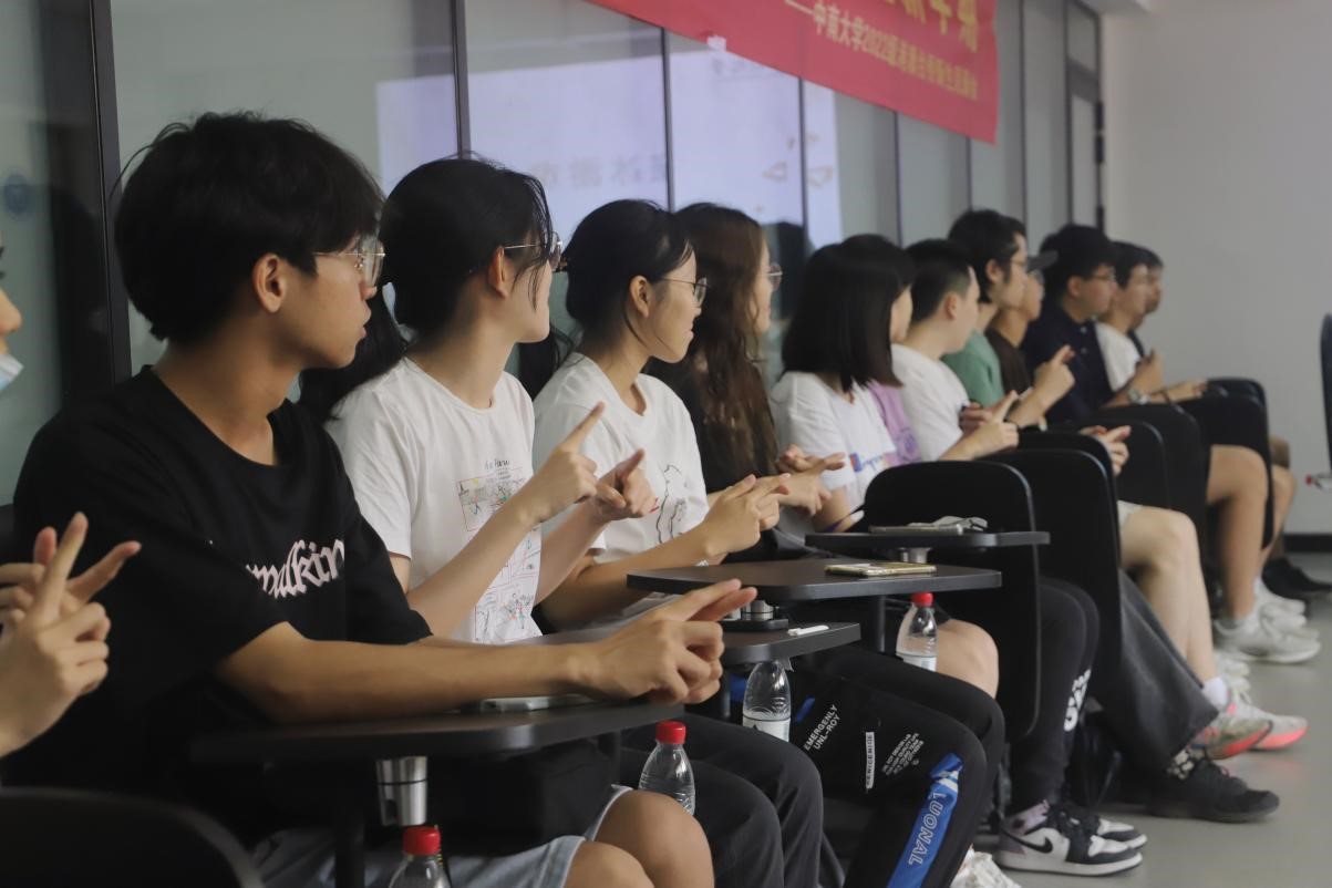 新生见面会在胡雨琪老师带领的破冰游戏中拉开序幕。在“手指欢迎操”小游戏中,同学们随着胡老师发出的指令,做出相应的食指敲击、拍打大腿以及跺脚等动作,用响亮的击打声表现出似火的热情。紧接着胡老师带领同学们开展了“名字滚雪球”、“寻找一个TA”等游戏,在有趣、轻松的游戏中新生们加深了对彼此的了解,拉近了彼此间的距离,也让此次见面会充满了欢声笑语。