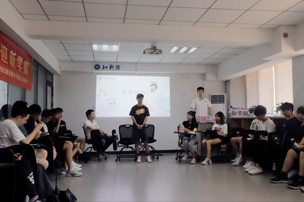 游戏环节结束后,港澳台侨老生代表陈松霖、何钊民、林丽缇分别发言,从学习、生活和学生工作等多个方面向学弟学妹们分享了经验。学长学姐们的分享不仅是答疑解惑,也是对新生最真挚的祝福。