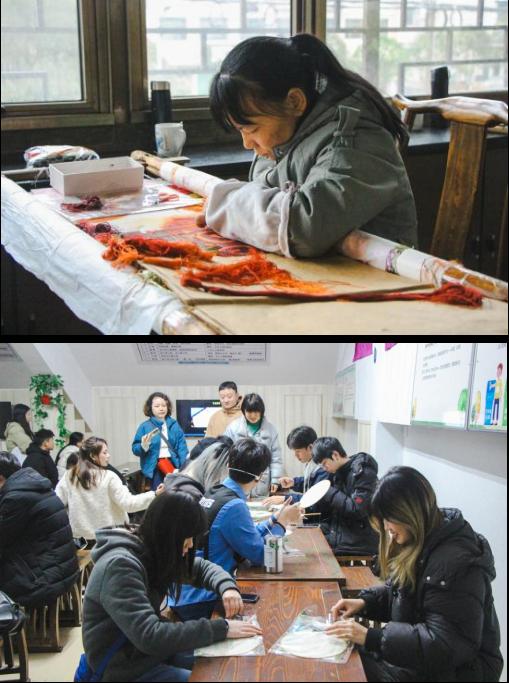 领略过湘绣之美,同学们来到绣道书院现场观摩刺绣大师的创作过程,并在专业刺绣老师的带领下亲自动手体验团扇刺绣,探寻和感受湘绣的魅力。“传统的湘绣针法主要分为平绣类、织绣类、网绣类、扭绣类和结绣类五种,不同的图案绘制,采用不同的针法,这样既能够增强绣品的真实性以及立体感,也能让其具有普通绘画达不到的艺术效果,尤其是湘绣老虎绣法鬅毛针技术更是湘绣工艺中最独特的艺术特色核心技术,为世人所惊叹。”指导老师引导大家体验了易学难精的平针绣法,“绣制湘绣不仅要眼到、手到,更要心到,要注意技法与心境的融合。”同学们认真学习,在湘绣初体验中收获满满,“没想到一件湘绣作品背后要付出这么多心血,其中的文化底蕴和工匠精神非常值得我们学习。”
