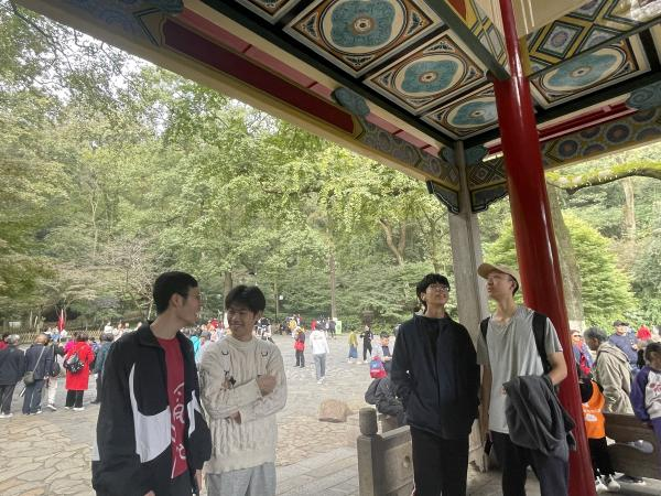 拾级而上,大家首先到达爱晚亭。红底鎏金匾额,《沁园春·长沙》雕刻,爱晚亭不仅是一个地标或一座建筑,更是一种文化的印记。早在上世纪初,青年时期的毛泽东就曾在爱晚亭探求革命真理。驻足于爱晚亭,同学们与历史伟人在同一片天空下呼吸、思考,在体会季节更替、岁月静美之时,心中更添一份对于历史人生的感悟。