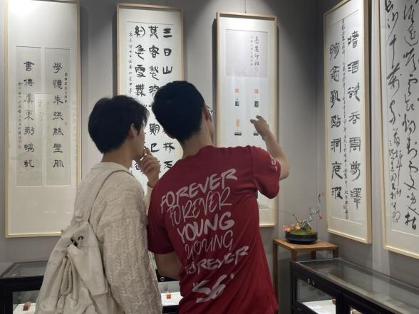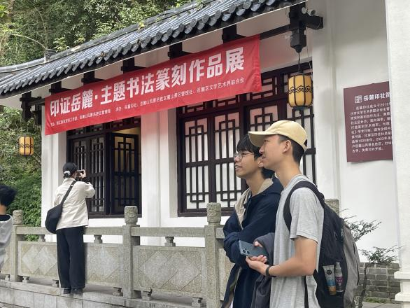 行至山腰,麓山寺旁的岳麓印社吸引了大家的目光,同学们入内参观印证岳麓·主题书法篆刻作品展。欣赏之余,港澳台同学们还用一口流利的粤语读起了墙上的书法篆刻作品,引来过往游客驻足称赞。