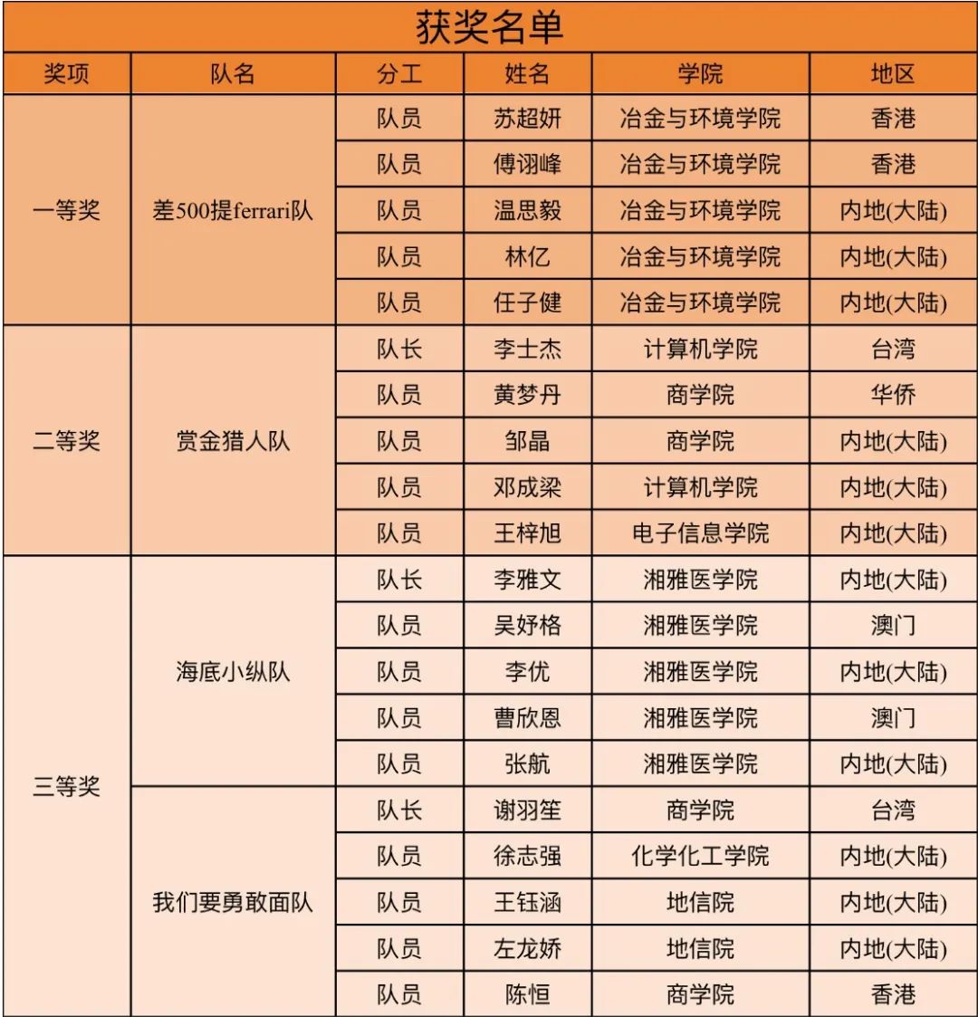 经过裁判组的统计和评估,最终获得一等奖的队伍是“差500提Ferrari”;获得二等奖的队伍是“赏金猎人队”;获得三等奖的队伍是“海底小纵队”和“我们要勇敢面队”,其余参赛队伍也获得了参与奖。涂图老师为获奖队伍颁发奖项并表示由衷的祝贺。在一片欢笑声中,老师同学们共同合影留念,本次港澳台学生趣味运动会圆满落幕。