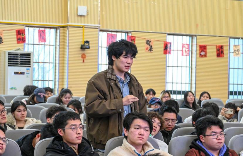 在互动环节,一名同学就中国外交官在公开场合致辞时的表达方式向张参赞提问。张参赞结合外交工作的实际需求,从外交话语的严谨性、国家立场的一致性以及跨文化传播的策略等方面作出细致解答,帮助同学们更深入地理解外交语言背后的原则与智慧。
